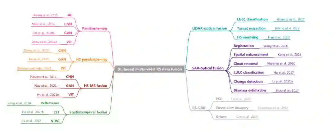 日益增多的多模态遥感数据对地观任务既是挑战,也是机遇。近年来,双方共同利用优势互补的特点,取得了重大突破。特别是与人工智能相关的技术,由于其在特征提取方面的优势,已经显示出其相对于传统方法的优势。在上述遥感大数据和前沿工具的推动下,基于深度学习的遥感多模态数据融合成为遥感领域的一个重要课题。因此,本文对这一快速发展的研究领域进行了全面的介绍,包括文献分析、系统总结了遥感融合研究的几个主要子领域、现有的研究资源,并对未来的发展进行了展望。具体来说,我们重点研究了第二部分,即不同融合子领域中基于深度学习的方法,并从使用的模型、任务和数据类型等方面进行了详细的研究。最后,令人鼓舞的是,近年来DL已经应用到多模态遥感数据融合的各个领域,并取得了巨大而有前景的成果,这为研究者今后进行深入研究提供了更多的信心。
