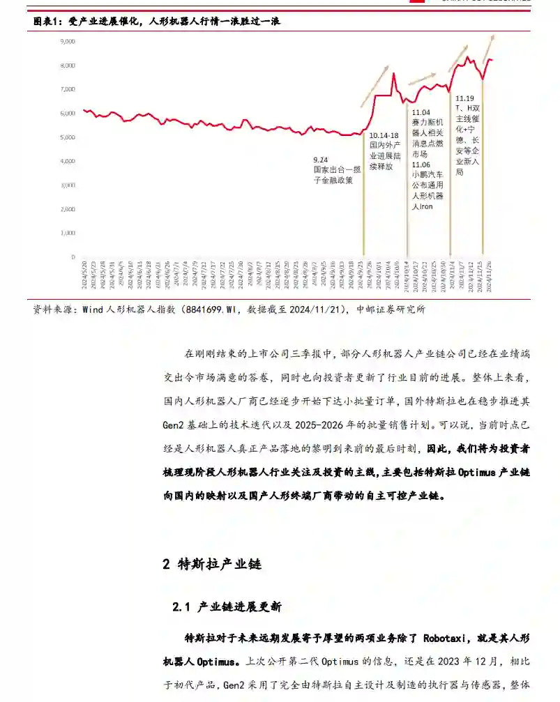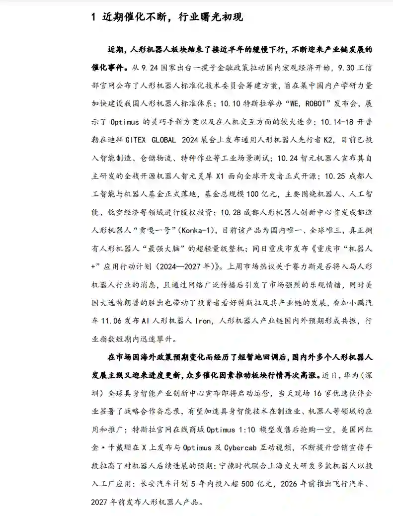 近期,人形机器人板块结束了接近半年的缓慢下行,不断迎来产业链发展的催化事件。先是国家出台一系列金融政策拉动国内宏观经济开始,而后国内外众多参与者的产业进展陆续释放,叠加国内科技领军企业入局人形机器人的消息面影响引燃市场情绪,人形机器人产业链国内外预期形成共振,行业指数短期内迅速攀升。在市场因海外政策预期变化而经历了短暂地回调后,国内外多个人形机器人发展主线又迎来进度更新,众多催化因素推动板块行情再次高涨。可以说,当前时点已经是人形机器人真正产品落地的黎明到来前的最后时刻,现阶段人形机器人行业关注及投资的主线,主要包括特斯拉Optimus产业链向国内的映射以及国产人形终端厂商带动的自主可控产业链。