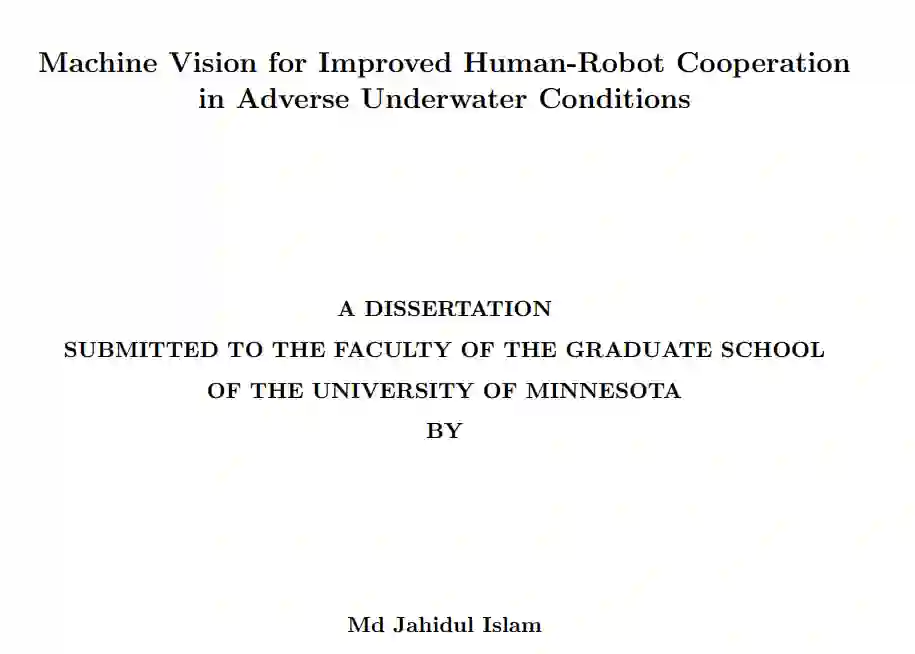 总之,本论文描述了我们为解决水下人机合作实时机器视觉所面临的环境和操作挑战而进行的尝试。针对各种重要应用,我们开发了稳健、高效的模块,让自动潜航器在仅依靠嘈杂的视觉传感的情况下,通过准确感知周围环境来跟随同伴潜水员并与之互动。此外,我们提出的感知解决方案能让视觉引导机器人在嘈杂条件下看得更清楚,并在有限的计算资源和实时限制条件下做得更好。除了推动最先进技术的发展之外,我们提出的方法和系统还让我们朝着缩小理论与实践之间的差距、改善野外人机合作的方向迈进了一步。