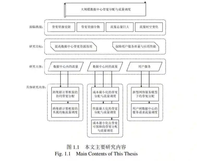 随着互联网和计算机技术的发展,基于互联网提供的各种应用和服务也越来越多了。作为这些应用服务载体的数据中心,其建设需求也在不断增加。然而,在数据中心发展的过程中,还面临着诸多亟待解决的关键科学问题和挑战。本论文主要关注大规模数据中心中带宽资源受限、带宽资源分散、流量总量巨大、流量时空变化这四类挑战,在总结现有方法和研究成果的基础之上,围绕数据中心内的流量、数据中心间的流量、以及用户服务请求这三个研究主体,展开对带宽分配和流量调度这两类问题的研究,具体的研究内容和贡献如下: