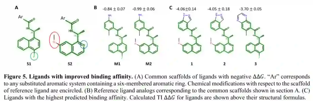 图5展示了两个优化的分子S1和S2,它们的结合亲和力分别提升了-0.84 kcal/mol和-0.99 kcal/mol。在TI ∆∆𝐺为负的配体中,有35个(~26%)分子具有相似的芳香体系。其中9个分子的预测结合亲和力提高了100倍以上。