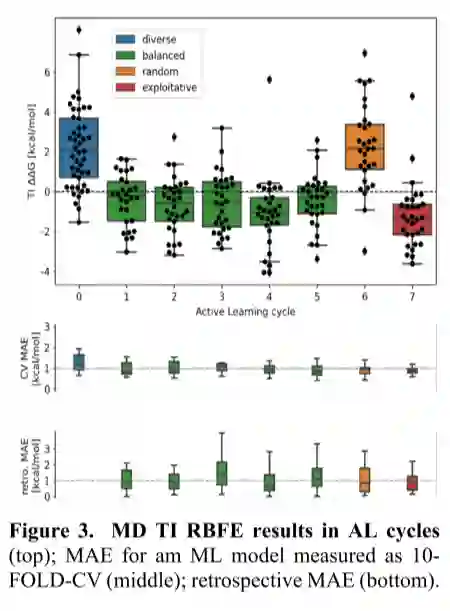 AutoML-AL方法共进行8个AL周期。周期0中,使用多样的分子初始化AL,以尽可能广泛地采样化学空间。为初始分子集进行TI MD 计算,并提供给AutoML模块用于初始ML模型。周期1-5中,均匀地选择了具有低RBFE的分子,以获得库的化学空间信息。周期6,随机选择分子,这种方式有助于克服AL被困在化学空间的局部最小值时可能出现的问题。