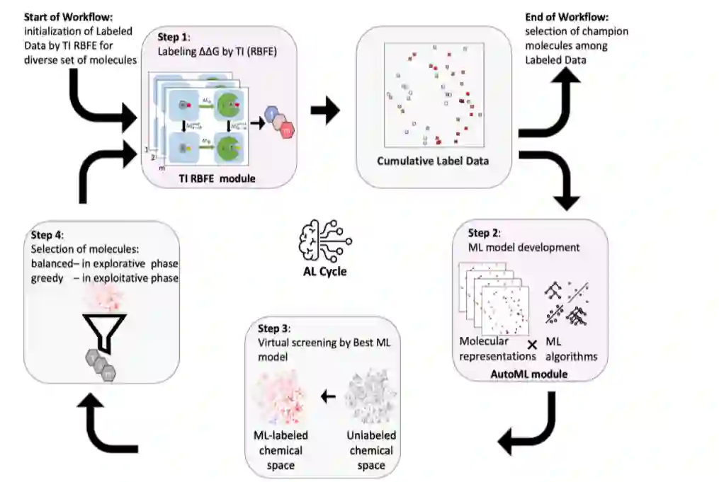 (1) 从分子的种子集开始,执行TI RBFE计算以获得训练数据和初始化的ML模型。 (2) 使用该模型筛选化学空间。 (3) 选择最佳候选分子集用于RBFE的TI MD计算。 (4) 对所选分子进行TI MD计算,并且用更新的数据重新训练ML模型。