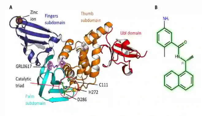图1 SARS-CoV-2 PLpro及其抑制剂的结构