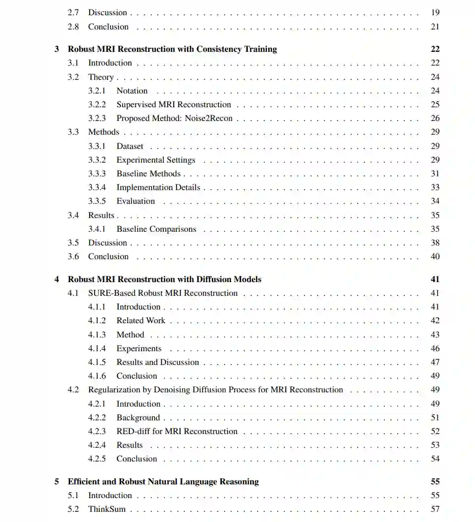深度学习(DL)在医学影像和自然语言处理(NLP)等领域取得了显著进展。然而,在实际应用中,仍然存在一些挑战。首先,解决复杂任务需要具有高表现力的大型神经网络,这在如加速磁共振成像(MRI)重建等高维设置中,对时间和内存效率提出了重大挑战。其次,DL算法通常对训练和测试之间的分布变化敏感。例如,基于DL的MR重建方法在临床相关的分布变化(如噪声、扫描器引起的漂移和解剖结构变化)下会急剧失败。同样,在NLP中,大型语言模型(LLMs)对文本输入(提示)的格式变化(如提示中单词的顺序)也敏感。因此,开发时间和内存效率高、对分布变化具有改进鲁棒性的算法至关重要。在本论文中,我们通过一系列项目解决了现有DL技术的效率和鲁棒性问题。首先,我们描述了一种用于MRI重建的内存高效训练策略GLEAM,它将端到端神经网络分解为解耦的网络模块。GLEAM在高维设置中显著提高了时间和内存效率,同时改善了重建性能。然后,我们描述了一种一致性训练方法,该方法同时使用全采样和欠采样扫描进行抗噪声MRI重建,称为Noise2Recon。我们展示了Noise2Recon在低信噪比设置下,使用更少的标记数据,以及在推广到分布外加速因子时,比现有DL技术更具鲁棒性。接下来,我们讨论了使用扩散模型提高MRI重建鲁棒性的方法。第一种方法,称为SMRD,在测试时进行自动超参数选择以增强临床相关分布变化下的鲁棒性。SMRD在分布外测量噪声水平、加速因子和解剖结构下提高了鲁棒性,测量噪声下的PSNR提高了高达6 dB。第二种方法,称为RED-diff,基于测量一致性损失和得分匹配正则化的变分推理方法。RED-diff在使用相同内存的情况下实现了3倍的推理速度提升。最后,我们提出了一种用于自然语言推理的高效且鲁棒的概率推理方法,称为ThinkSum。ThinkSum是一种两阶段概率推理算法,它以结构化的方式推理对象或事实集合。在第一阶段,LLM在从提示或辅助模型调用中提取的一组短语上并行查询。在第二阶段,这些查询的结果被聚合以做出最终预测。我们展示了ThinkSum在困难的NLP任务上提高了性能,并且与标准提示技术相比,对提示设计更为鲁棒。此外,我们展示了ThinkSum可以同时处理对LLMs的并行查询,以提高效率。