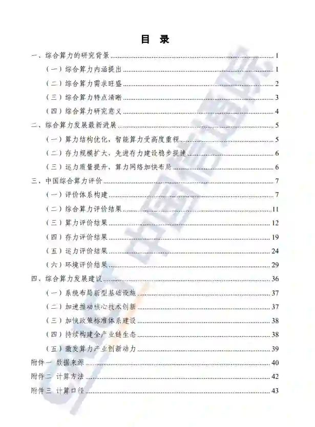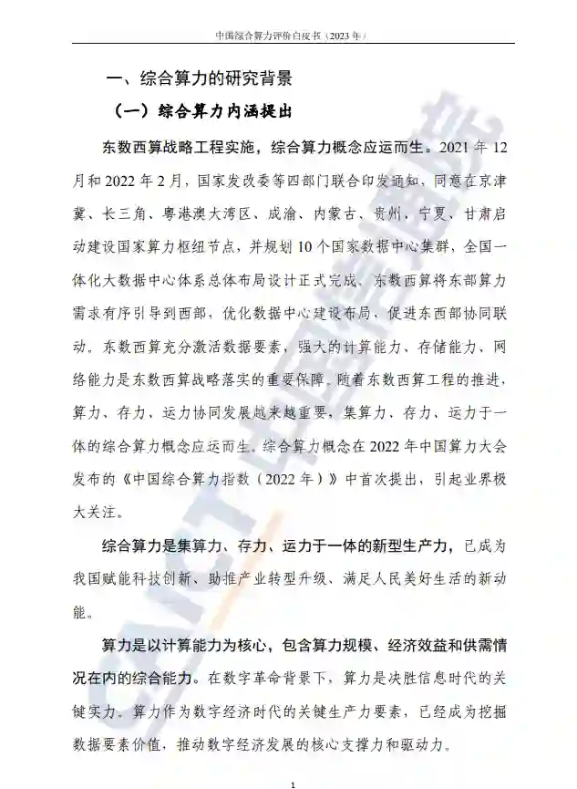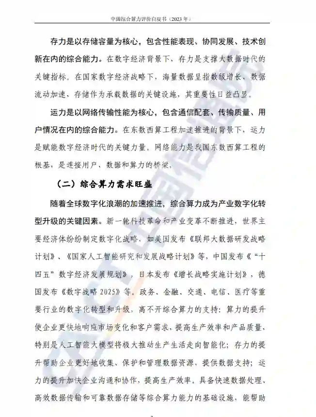 新一轮科技革命和产业革命加速演进,算力为越来越多的行业数字化转型注入新动能,综合算力作为集算力、存力、运力于一体 的新型生产力,成为支撑数字经济发展的重要力量。随着5G、人工智能等信息技术的发展,算力需求不断增长,算力产业迎来重要发展机遇。我国不断加大对计算、存储和网络等基础设施的投入,高度重视数据中心、智算中心、超算中心以及边缘数据中心等算力基 础设施的高质量发展。截至2022 年年底,我国算力核心产业规模达 到1.8 万亿元,算力总规模达到180EFLOPS1,年增长率近30%;存 力总规模超过 1000EB;国家枢纽节点间的网络单向时延降低到 20毫秒以内。随着我国经济的快速发展,单一的算力评价已经不能满足我国高质量发展的要求。中国综合算力评价体系为全社会推进算力升级、 推动经济高质量发展提供支撑。《中国综合算力评价白皮书(2023年)》全面阐述了综合算力的内涵和定义,构建了涵盖算力、存力、运力、环境等关键因素的综合算力评价指标体系,多维度客观分析了我国综合算力的发展情况,并给出推动综合算力发展的建议,为我国综合算力的技术创新与基础设施建设提供参考。