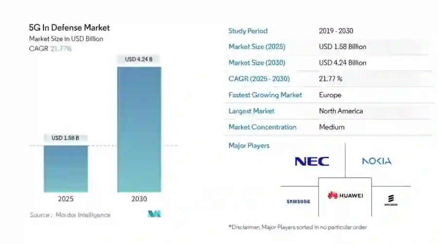 而且,5G的技术进步实现了超高速率、低延迟和高带宽。这些特性支持远程武器系统、实时视频监控以及用于作战场景中更快响应时间的边缘计算等应用。