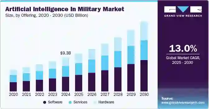 2024年全球军事人工智能市场估值为93.1亿美元,预计在2025年至2030年间将以13.0%的复合年增长率增长。国防投入增加、自主系统发展以及人工智能驱动的预测性分析,共同推动了人工智能在全球军事行动中的应用。