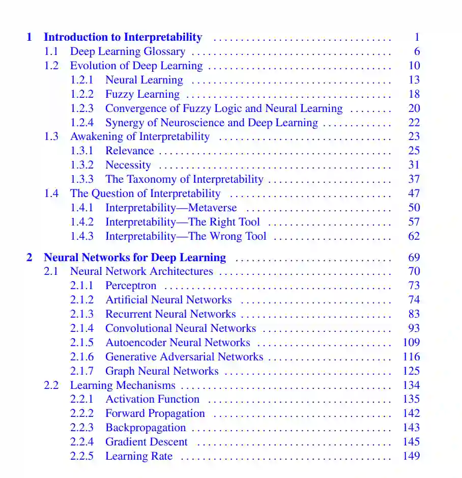 在第一章中,我们介绍了本书的背景和动机,帮助读者设定对本书的期望并理解材料的范围。我们还通过总结深度学习的演变提供了一个简短的历史。在此过程中,我们也阐明了这种演变如何导致知识抽象化的增加,从而形成了众所周知的黑箱模型,它编码了知识但并未解释知识。我们自然地将这个讨论引向可解释性的问题,确定了其必要性以及所面临的挑战。我们也澄清了本书的重点是解决现有深度学习架构中的可解释性,而将新的天然可解释的深度学习架构的设计主题委托给最后一章的一个小节(并可能在未来的本书第二卷中)。
