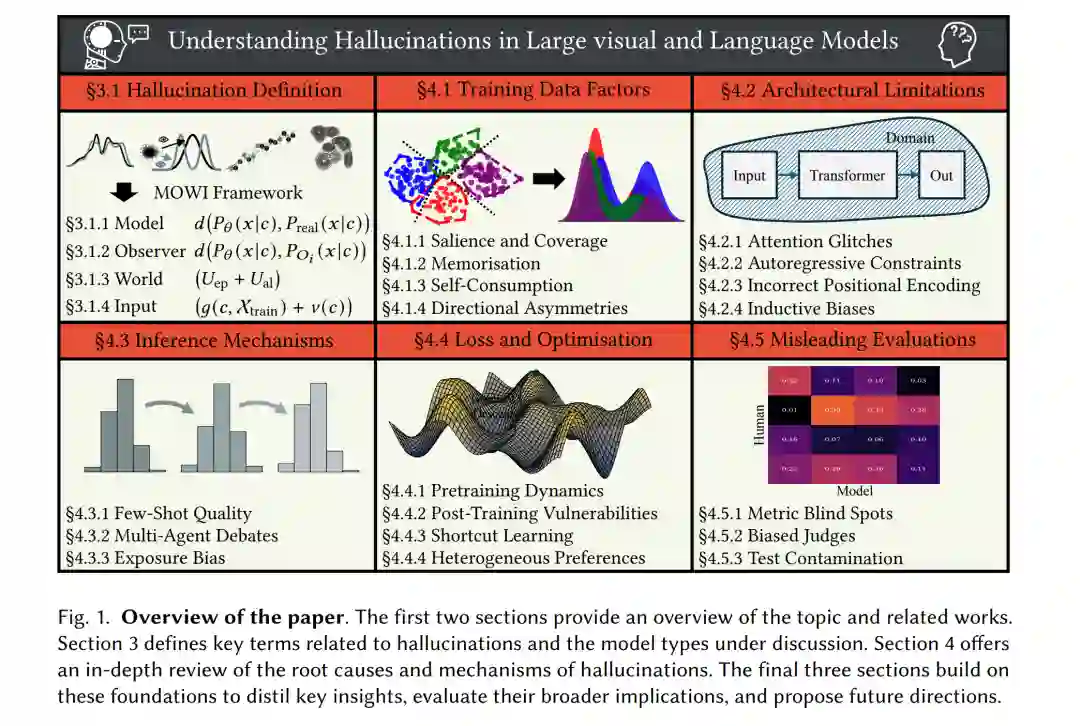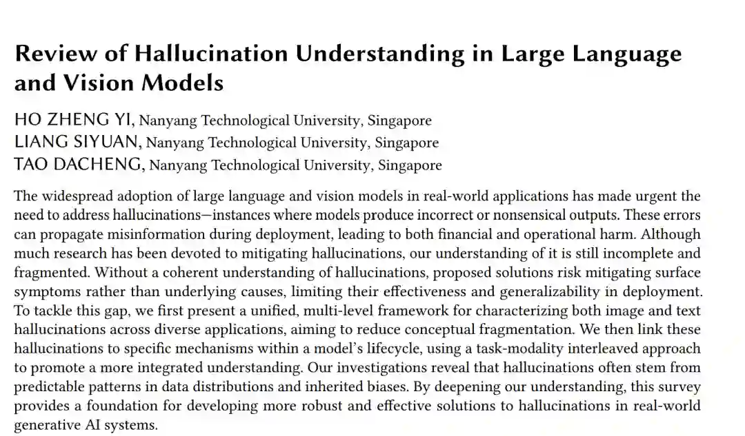 随着大语言模型与视觉模型在现实应用中的广泛采用,如何应对“幻觉”问题——即模型生成错误或无意义输出的情况——已成为紧迫需求。这类错误在部署过程中可能导致错误信息的传播,从而带来财务和运营上的损失。尽管已有大量研究致力于缓解幻觉,但我们对其的理解依然不完整且零散。缺乏统一的理解框架可能导致现有方法只是在缓解表层症状,而非解决深层原因,从而限制了方法在实际部署中的有效性与普适性。 为弥补这一空白,我们首先提出了一个统一的、多层次框架,用于在不同应用场景下表征文本和图像幻觉,从而减少概念上的碎片化。随后,我们将这些幻觉与模型生命周期中的特定机制联系起来,并通过一种任务-模态交织的方法促进更为整体的理解。我们的研究表明,幻觉往往源于数据分布中可预测的模式以及继承的偏差。通过加深对幻觉的理解,本综述为开发更健壮、更有效的解决方案奠定了基础,从而提升生成式人工智能系统在现实环境中的可靠性。 **