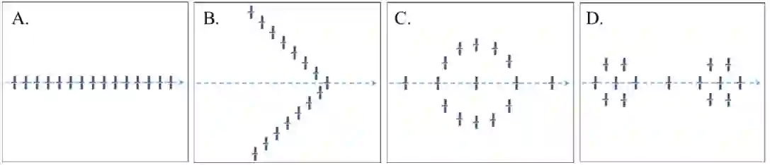 图1. 几种原型卫星轨道飞行编队配置,如A.领队-跟随者,B.交错扫掠梯队,C.和D.环形投影和领队-跟随者组合。