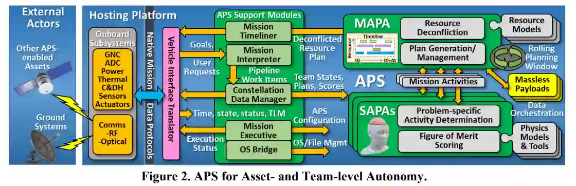 2.我们与CU合作,利用/扩展图中 "专业化自主代理 "框中显示的 "编队飞行SAPA "的代码。这使得APS规划系统能够确定卫星编队,以满足目标管理器断言的某些任务目标。这一新的SAPA考虑了团队中单个资产的状态/位,确定了在下一个编队中占据 "位置 "或 "角色 "的分配,并确定了完成过渡所需的机动(姿态控制和推进器应用的组合)。