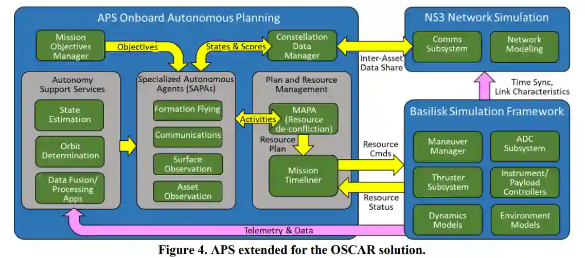 我们的团队汇集了两项关键技术来创建最初的OSCAR设计和原型。首先,我们利用Orbit Logic的自主规划系统(APS)作为OSCAR的分布式规划框架。其次,我们利用科罗拉多大学的Basilisk框架作为航天器的功能子系统接口,并支持行星环境中的动态卫星模拟。