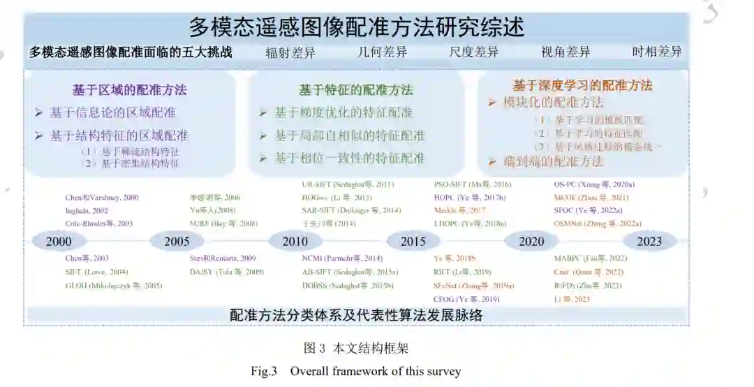 随着对地观测技术的不断发展,从星载、机载和地面平台上众多的一体化立体观测设施被发射,这些传感器设备可以动态提供不同空间、时间和光谱分辨率的多模态遥感图像,只有充分利用各类多模态遥感图像才能有效地为自然资源管理、防灾减灾和环境监测等不同应用提供更可靠和全面的对地观测结果。但是由于不同传感器之间的成像机理不同,多模态图像之间呈现显著的辐射差异、几何差异、时相差异和视角差异等,给多模态遥感图像高精度的配准带来了巨大的挑战。为推进多模态遥感图像配准研究技术的发展,本文对当前主流的多模态遥感图像配准方法系统性地进行了梳理、分析、介绍和总结。首先梳理了单模态到多模态遥感图像配准的研究发展演化过程;然后分别分析了基于区域、基于特征和基于深度学习方法中代表性算法的核心思想,并给出已开源代码的链接;同时分享了现有公开的多模态遥感图像配准数据集,并介绍了数据集的详细内容和特点;最后给出了现阶段多模态遥感图像高精度配准研究中所存在的一些问题和严峻挑战,并对未来研究的发展趋势进行了前瞻性的展望,旨在推动多模态遥感图像配准领域实现更加深入的突破和创新。