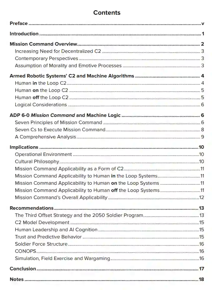 美国陆军和整个国防部的作战能力有两个根本性的重要属性:一个侧重于分布式人类-士兵的C2,另一个侧重于在21世纪中期部署武装自主机器。这些属性似乎是相互矛盾的。美国陆军战争学院的《2018-2020年关键战略问题清单》确定了这种人与机器并列的战略意义,特别是在主题2的一个问题中,该问题指示如下: 评估陆军在多领域战场上执行任务指挥和控制的能力,其中包括:友军和敌军的无人系统、半自主(人在回路中)的机器人系统和自主(没有人在回路中)的机器人系统。