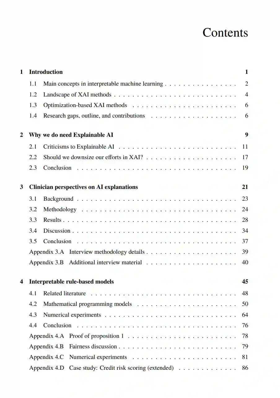 在过去的十年中,机器学习(ML)与人工智能(AI)在各个领域都经历了关注度的爆发式增长。关于 AI 的研究产出巨大,且基于 AI 的系统正越来越多地被开发并部署于敏感领域(sensitive domains),其决策可能对个人和社会产生重大影响。以医疗保健为例,预测模型已被用于对患者进行分诊、资源分配以及支持临床决策(如 Eke 和 Shuib, 2024; Tun et al., 2025)。这意味着,人们正在开发 AI 决策支持工具,以协助医生在诊断、治疗规划及手术流程等方面做出决策。 尽管这些系统具有提高准确性和效率的潜力,但将其引入工作流也带来了新的风险。最重要的一点是,许多基于 AI 的系统是不透明的(opaque),无法为其预测提供透明度或逻辑依据(rationale),导致人们难以理解并接受这些预测。通常,模型决策过程如何与人类推理或专家知识保持一致尚不明确,而且源自不透明系统的预测结果往往难以进行质疑或反驳。因此,建立对这些系统的信任——这通常是成功采用并集成到工作流中的先决条件——仍然困难重重(如 Eke 和 Shuib, 2024; Nouis et al., 2025)。这些挑战催生了日益增长的**可解释 AI(Explainable AI, XAI)研究领域,其目标是提高模型的透明度与可解释性(interpretability),进而增强其可信度(trustworthiness)。 虽然 XAI 领域的兴起主要源于 AI 系统在实践中因用户缺乏信任及对预测逻辑不理解而导致的采用缓慢,但伦理和法律层面的影响同样呼吁更高的透明度。由于将基于 AI 的系统引入关键决策过程引发了关于问责制、责任归属以及伦理方面的疑虑(如 Li et al., 2023; Nouis et al., 2025),监管准则已相继出台,以确保特别是在医疗等高风险领域具有充足的透明度。例如,GDPR(欧洲议会和欧盟理事会,2016)确立了“不受仅基于自动化处理的决策影响的权利”(第 22(1) 条),并要求向个人提供“有关所涉及逻辑的有意义信息”(第 13(2)(f)、14(2)(g)、15(1)(h) 条)。近期,《欧洲人工智能法案》(European AI Act,欧洲议会和欧盟理事会,2024)已正式生效,该法案要求 AI 系统必须具备足够的透明度,以便用户解释结果并实现有效监管,尤其是在高风险领域。 虽然该领域广受欢迎,但它仍处于起步阶段,目前的手段从技术角度来看仍有提升空间,且在许多情况下仍需在实践中进行验证。为了解决这一问题,本论文从结合社会科学与数学的多学科视角(multidisciplinary perspective)**出发探讨 XAI,既提出了新的可解释性与演绎性方法的算法,同时也研究了用户及其对所提方法的反应。