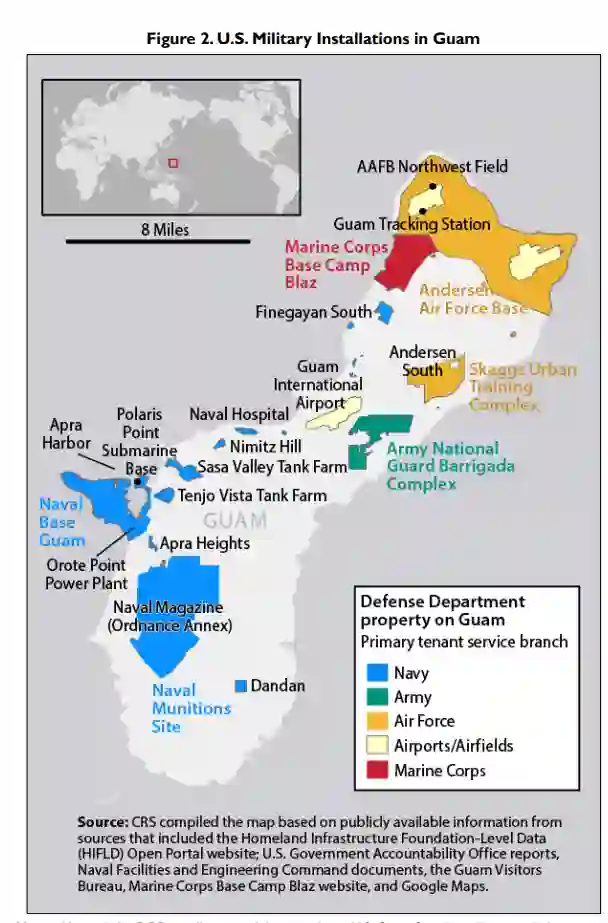关岛是美国在印度洋-太平洋地区最西端的领土,约有 170,000 名美国公民。美国国防部(DOD)拥有关岛约 25% 的土地,并在岛上驻扎了约 6400 名现役军人。关岛在支持美西太平洋地区的空军和海军行动方面发挥着重要的国防作用。关岛的地理位置处于大国和朝鲜军队的导弹射程之内。