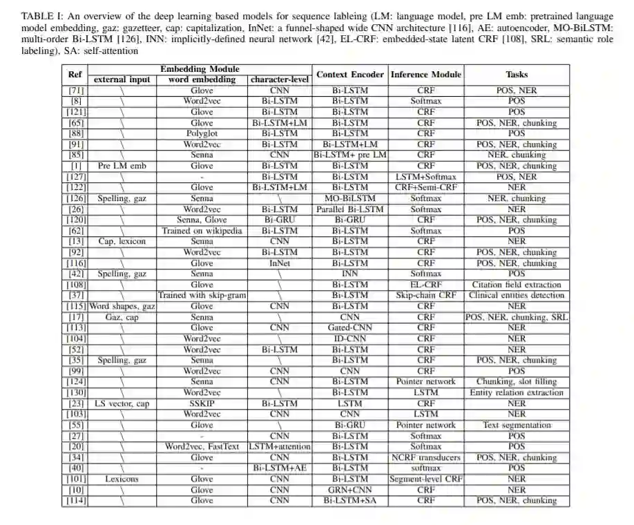 本综述的目的是全面回顾深度学习在序列标记(SL)领域的最新应用技术,并提供一个全景,以启发和指导SL研究社区的研究人员和从业者快速理解和进入该领域。具体来说,我们对基于深度学习的SL技术进行了全面的调研,并按照嵌入模块、上下文编码器模块和推理模块三个轴进行了科学的分类,系统地总结了目前的研究现状。此外,我们还概述了序列标记领域中常用任务的实验设置(即数据集或评价指标)。此外,我们讨论和比较了最具代表性的模型给出的结果,以分析不同因素和建筑的影响。最后,我们向读者展示了当前基于dll的序列标记方法所面临的挑战和开放问题,并概述了该领域的未来发展方向。