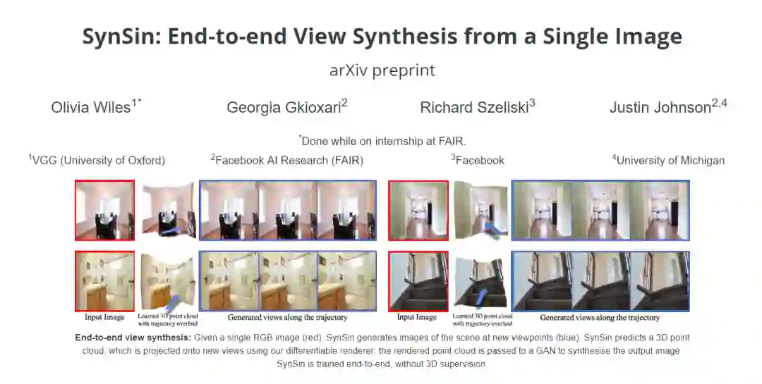 我们提出了一种单一图像视图合成方法,允许从单一输入图像生成新的场景视图。这是一个挑战,因为它需要从一个单一的图像全面理解3D场景。因此,目前的方法通常使用多幅图像,在地面真实深度上训练,或者局限于合成数据。为此,我们提出了一种新颖的端到端模型;它被训练在真实的图像上,没有使用任何真实的3D信息。为此,我们引入了一种新的可微点云渲染器,用于将潜在的3D点云特征转换为目标视图。我们的细化网络对投影特征进行解码,插入缺失区域,生成逼真的输出图像。我们的生成模型内部的3D组件允许在测试时对潜在特征空间进行可解释的操作,例如,我们可以从单个图像动画轨迹。与以前的工作不同,我们可以生成高分辨率的图像,并推广到其他输入分辨率。我们在Matterport、Replica和RealEstate10K数据集上超越基线和前期工作。