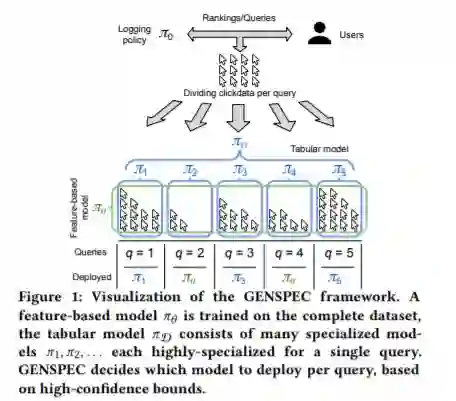 现有的反事实学习排名(LTR)工作集中于优化基于特征的模型,该模型基于文档特征预测最优排名。基于bandit算法的LTR方法通常优化表格模型,这些表格模型记住每个查询的最佳排名。这些类型的模型都有各自的优点和缺点。基于特征的模型在许多查询(包括那些以前未见过的查询)中提供了非常健壮的性能,但是,可用的特征往往限制了模型可以预测的排名。相反,表格模型通过记忆可以收敛于任何可能的排名。然而,记忆非常容易产生噪音,这使得表格模型只有在大量用户交互可用时才可靠。我们能否开发一种稳健的反事实LTR方法,在安全的情况下追求基于记忆的优化? 我们介绍了泛化和专门化(GENSPEC)算法,这是一种鲁棒的基于特征的反事实LTR方法,在安全的情况下,它会对每个查询进行记忆。GENSPEC优化了单个基于特性的模型以实现泛化:跨所有查询的健壮性能,以及用于专门化的许多表模型:每个表模型都针对单个查询优化了高性能。GENSPEC使用新颖的相对高可信度边界来选择每个查询部署哪个模型。通过这样做,GENSPEC成功地实现了专门化表格模型的高性能和基于特征的广义模型的鲁棒性。我们的结果表明,GENSPEC可以在具有足够点击数据的查询上获得最佳性能,而在数据很少或有噪声的查询上具有健壮的行为。