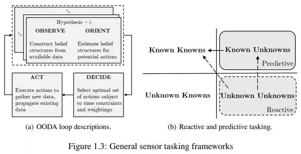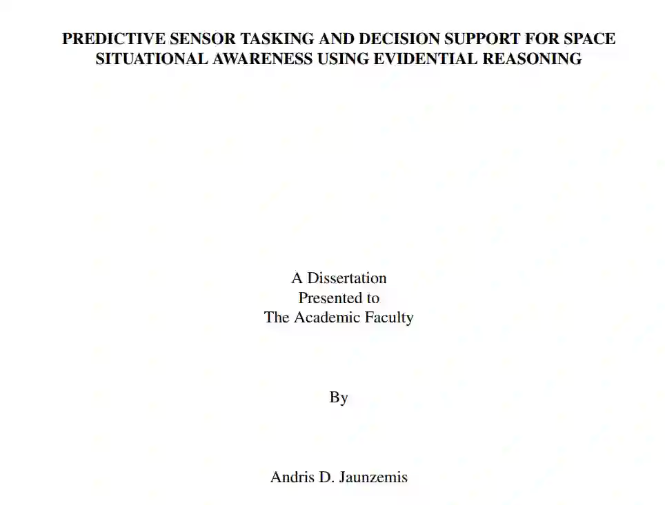 态势感知是对环境因素的感知、对其含义的理解以及对其未来状态的预测。空间态势感知(SSA)尤其关注准确呈现空间物体的状态知识,以解决碰撞等潜在威胁。空间监视系统中使用的跟踪技术在很大程度上仍然依赖于 20 世纪 50 和 60 年代的模型和应用,而随着传感器技术的改进和进入太空的便利性,被跟踪物体的数量在不断增加。这项研究将空间监视系统的传感器任务分配问题归纳为使用证据推理来询问特定假设。首先,应用认知系统工程实践来推导 SSA 决策支持系统的认知工作和信息关系要求,并深入探讨基于假设的方法在 SSA 中的实用性。为评估基于假设的 SSA 方法,将航天器异常检测问题表述为使用距离度量的二元假设检验,同时考虑非高斯边界条件,以提高对非线性轨道动力学的适用性。接着,制定了传感器任务分配标准,以收集证据,最大限度地减少假设解析中的模糊性或无知。证据推理的应用为量化模糊性提供了一个严格的框架,并允许纳入各种 SSA 传感器。在此方法的基础上,针对假设解析任务提出了一个通用证据收集框架,即司法证据推理(JER)。JER 还通过应用同等努力原则来考虑确认偏差。资源分配是一个非线性、高维、混合整数问题,因此 JER 还应用了对抗优化技术来解决计算可操作性问题。最后,根据得出的要求开发了一个 SSA 决策支持系统原型,以评估基于假设的任务分配对工作量和态势感知的影响。这项工作旨在使预测性传感器任务分配能够提供决策质量信息,并改善决策者的态势感知和工作量。