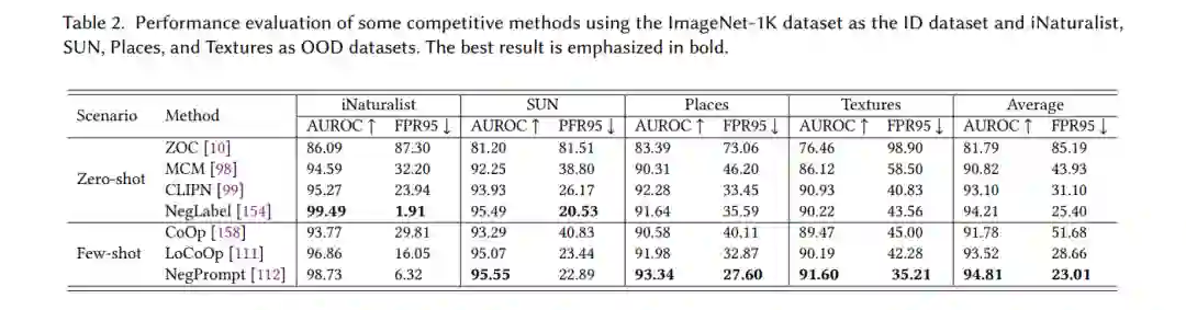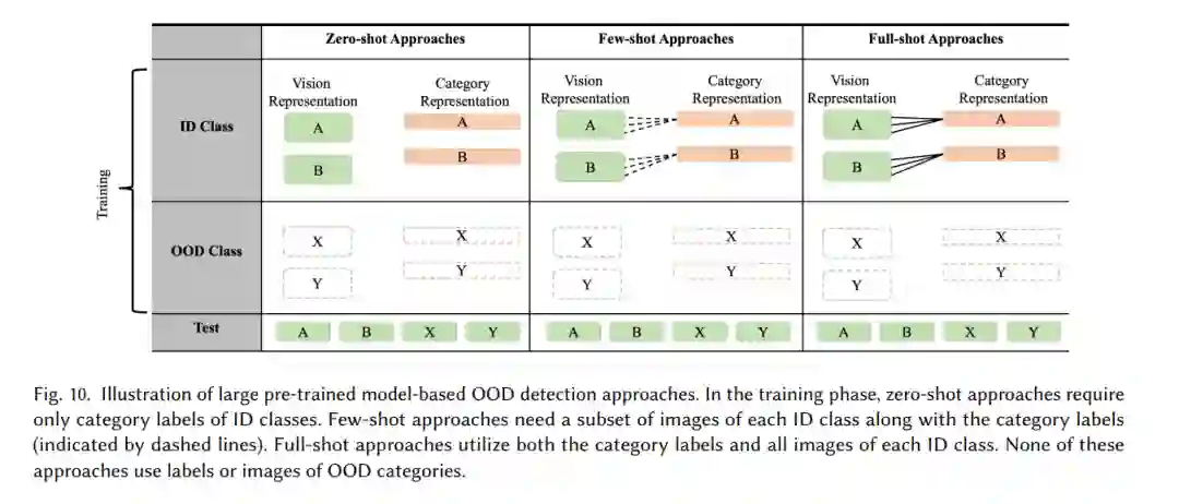 大型预训练模型在众多下游同分布(ID)分类任务中展示了卓越的性能,但它们在OOD检测任务中的潜力尚未被广泛探索。近期的研究[145]指出,较高的ID分类准确率与更好的OOD检测性能之间存在关联。因此,基于大型预训练模型的OOD检测问题应运而生。近年来,各种类型的大型预训练模型,包括单模态模型(如ViT [146]、BERT [147]、Diffusion [148]),视觉语言模型(VLMs)(如CLIP [149]、多模态Diffusion [150]、ALIGN [151]),以及大型语言模型(LLMs)(如GPT-3 [152]),逐渐被应用于OOD检测任务,如图9所示。利用大型预训练模型强大的表征能力,进一步放宽了OOD检测任务的限制,推动了更具挑战性和现实性的场景成为研究热点。根据大型预训练模型接触到的ID样本数量,基于大型预训练模型的OOD检测可以分为零样本、少样本和全样本OOD检测,如图10所示。表2总结了几种相关竞争方法的性能评估,以提供该领域OOD检测性能水平的理解。**