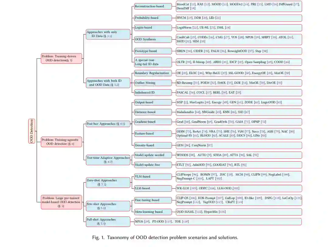 OOD检测对于可信赖的机器学习至关重要。在本文中,我们首次从问题场景的角度,全面回顾了OOD检测的最新进展,重点介绍了训练驱动、训练无关和基于大型预训练模型的OOD检测。我们还总结了广泛使用的评估指标、实验协议和多样化的应用场景。我们相信,本文对现有论文的新分类法以及对新兴趋势的深入讨论,将有助于更好地理解当前的研究现状,帮助从业者选择合适的方法,并激发新的研究热点。