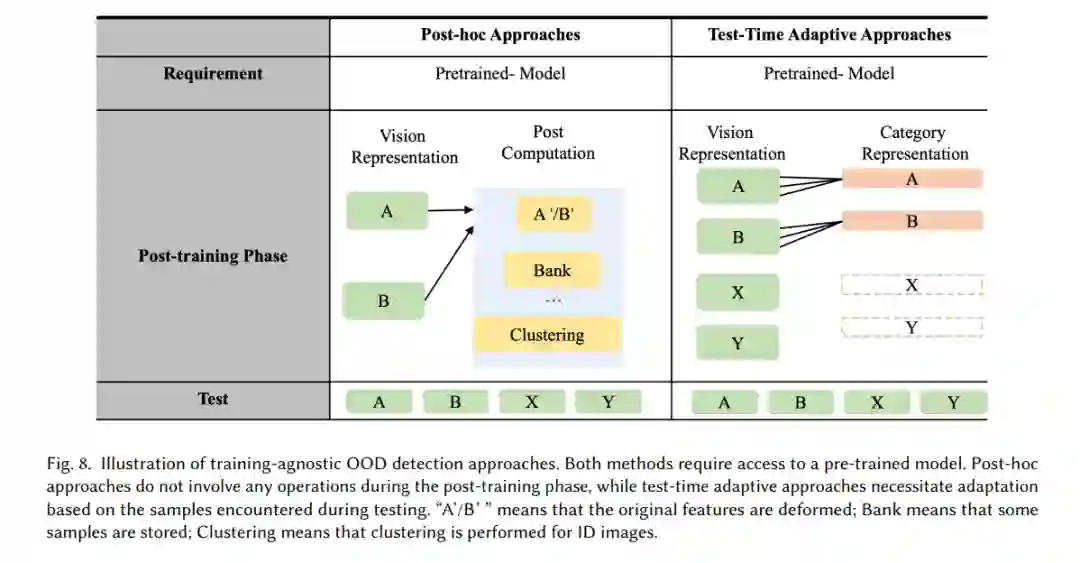 训练无关的OOD检测主要强调测试时的适应策略,而不是像训练驱动的OOD检测那样注重分类器性能。根据是否依赖测试数据之间的相关性,这类方法被分为两类:事后方法和测试时自适应方法,如图8所示。事后方法独立计算每个样本的结果,不受其他样本变化的影响。相反,测试时自适应方法在测试样本之间表现出依赖性。**