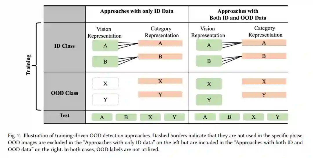 在训练驱动的OOD检测问题中,研究人员设计预训练过程,以获得具备优越OOD检测能力的模型。根据训练过程中是否可以访问OOD数据,我们将这一场景下的方法进一步分为两类:仅使用ID数据进行训练,以及同时使用ID和OOD数据进行训练,如图2所示。