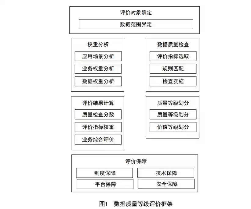 数据质量评价是在评价保障基础上通过确定评价对象,业务权重和数据权重的分析,对数据选取的 准确性、一致性、完整性、规范性、时效性和可访问性等指标进行数据质量检查,计算数据质量评价分 数,确定数据质量等级的过程。数据质量等级评价流程主要包括评价对象确定、权重分析、数据质量检查、评价结果计算、质量等 级划分和评价保障等七个环节。