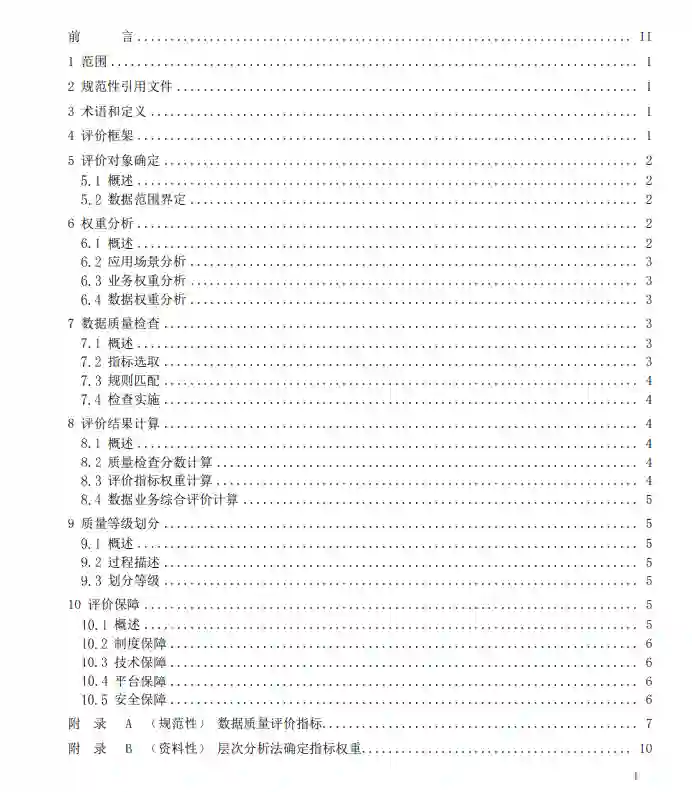 随着数据量的增长,数据的价值不断凸显,规范化进行数据管理成为数据全 生命周期重要环节,但是数据的质量问题参差不齐,给数据管理带来极大的困难, 对数据进行合理的质量分析,给出定量的数据质量结论,为后续数据治理、数据 交易等环节提供质量保障,目前,国内外在这方面的研究仍然比较欠缺,主要研 究成果集中数据管理平台、数据质量评价指标分析。在数据质量评价过程中,评 价的流程多样化,评价维度不统一,如何规范、系统开展物联网数据质量评价与 确定数据质量评价等级是当前亟待解决的问题。 《物联网 数据质量》是组织开展数据质量评价与数据质量等级确定的指导性 文件。它有助于引导数据质量评价实施工作的标准化、规范化,满足组织对数据 质量评价的需求,帮助组织确定与提升数据价值,推进数据的高质量发展;同时 能够指导组织进行数据质量评价现状研究,逐步提升数据质量水平。