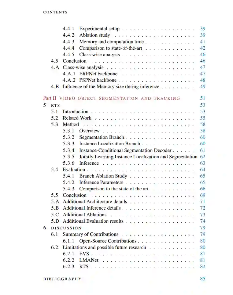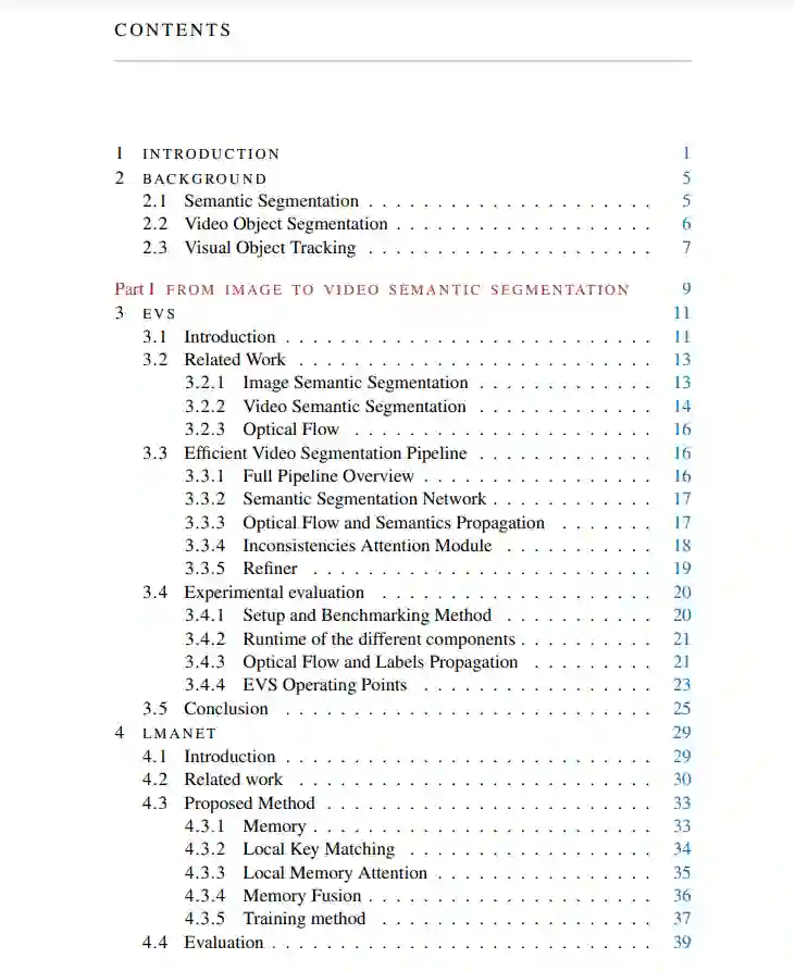 视频场景理解涵盖了多个基础且具有挑战性的计算机视觉任务,这些任务相互补充。其中一些任务本质上是基于一系列连续的图像进行推理,而其他任务可以分别在每个帧上处理。在这篇论文中,我们专注于这些任务的一个子集,从全局场景理解的角度开始,使用语义分割,最终关注于更局部的视觉对象跟踪(VOT)和视频对象分割(VOS)。在这个范围内,我们探讨了利用和结合时间线索来提高处理视频时场景理解算法的不同方法。更具体地说,我们首先在第一部分分析了视频中发现的时空相关性如何用来提高单帧语义分割方法的帧率或准确性。首先,我们使用光流作为在帧之间传播语义信息的手段,并构建了一个实时视频语义分割的流程,该流程在GPU和CPU之间平衡计算负载。我们没有设计一个重型的神经网络在GPU上推断所有内容,而是建议将GPU任务集中在从零开始预测分割掩模或完善传播的标签上。与此同时,运行在CPU上的快速光流提供了从一个帧移动到下一个帧的运动矢量。对于可能的光流错误,精细化由一个轻量级模块进行。我们提出了几个操作点,提供了速度和准确性之间的不同权衡,并观察到我们的方法可以在分割准确性略有下降的情况下大大加速。接着,我们提出直接利用时态相关性和外观线索,而无需额外的光流模块。为了实现这一目标,我们在一个记忆模块中汇总来自先前帧的语义信息,该模块可以通过注意机制来使用。我们设计了我们的流水线,首先访问存储在内存中的过去帧的深度特征,并在每个像素周围的局部邻域中匹配它们。这些时空线索随后与当前帧编码融合,以提高最终的分割预测。我们的方法引入了一套简单而通用的模块,这些模块可以将几乎任何现有的单帧方法转换为视频流水线。我们在两个流行的单帧语义分割网络上展示了我们的架构在分割准确性方面的改进。在第二部分,我们将注意力转向在视频中跟踪和分割单个对象的任务,并希望弥合两者之间的鸿沟。我们特别研究它们之间的关系,并展示在VOT背景下使用分割掩模的好处。为此,我们提出了一个以分割为中心的方法,与大多数现有方法相反,该方法在内部使用分割掩模,并无需额外模块就能预测分割掩模。一个受现有跟踪器启发的专用实例定位分支被用来为VOT挑战带来必要的鲁棒性,并调节分割解码器以预测正确的分割掩模。我们展示了与其他跟踪器相比,我们的统一架构在鲁棒性和准确性方面都取得了最先进的结果,同时生成了准确的分割掩模。
