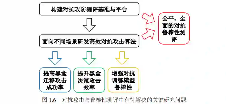 对抗攻击与鲁棒性测评作为深度学习鲁棒性 研究中的重要方向,旨在面向不同场景高效地生成对抗样本并针对深度学习模型 的鲁棒性进行全面的测评。此方面研究有助于发现深度学习模型的脆弱性,比较 不同模型的鲁棒性,以及发展更加鲁棒的深度学习模型。对抗攻击与鲁棒性测评方面的研究仍然存在一些亟待解决的问题。第一,现 有对抗攻击方法在无法获取模型结构和参数信息的黑盒场景下攻击成功率与效率 较低,阻碍了模型脆弱性机理的分析。第二,现有对抗攻击方法生成对抗样本的 多样性不足,限制了基于这些对抗样本训练所得模型的鲁棒性。第三,目前对抗 鲁棒性测评的研究工作较为欠缺,研究者难以有效评估不同深度学习模型的鲁棒 性以及对抗攻防算法的有效性。为解决上述关键问题,本文构建对抗攻防测评基 准与平台,并面向不同场景研发高效对抗攻击算法。