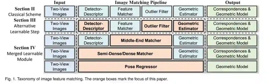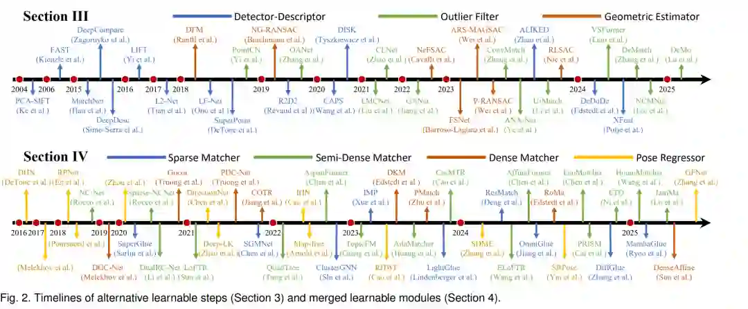 上述可学习方法将在第 3 和第 4 节中分别详述。我们还通过图 2 所示的时间轴,描绘了基于深度学习的图像匹配方法的发展历程。 本文旨在系统回顾机器学习和深度学习如何逐步替代经典图像匹配流程中的各个组件,回顾各独立模块和融合框架的演进历程,并通过多项任务的统一实验比较不同方法的优劣。已有的相关综述多集中于流程中的某一阶段。例如,一些早期综述仅聚焦于特征检测与描述阶段,涵盖了人工设计方法 [11][12][13] 与可学习方法 [14][15];Zitova 等人 [16] 对整个流程进行了更广泛的概览,但该工作早于学习方法的兴起;Ma 等人 [17] 首次覆盖了全流程的手工与可学习方法,但未涉及近期发展的融合模块。较新的综述 [18][19] 提出了“基于检测器的方法”与“去检测器的方法”等新术语,但未明确将这些方法与传统流程对应,也未全面涵盖可学习的几何估计器、位姿回归器、多个离群点过滤器及新近图像匹配方法。 相比之下,本文专注于基于学习的方法,具体贡献如下: * 提出一种与经典流程对齐的分类方法,全面覆盖了可替代的可学习模块与融合式可学习模块,见图 1; * 补充了此前综述中遗漏的相关方法,提供最新全面的图像匹配研究全貌; * 在相对位姿估计 [20]、单应性估计 [21]、匹配准确率评估 [22] 与视觉定位 [23] 等任务上开展统一实验,实现公平一致的跨类别比较。