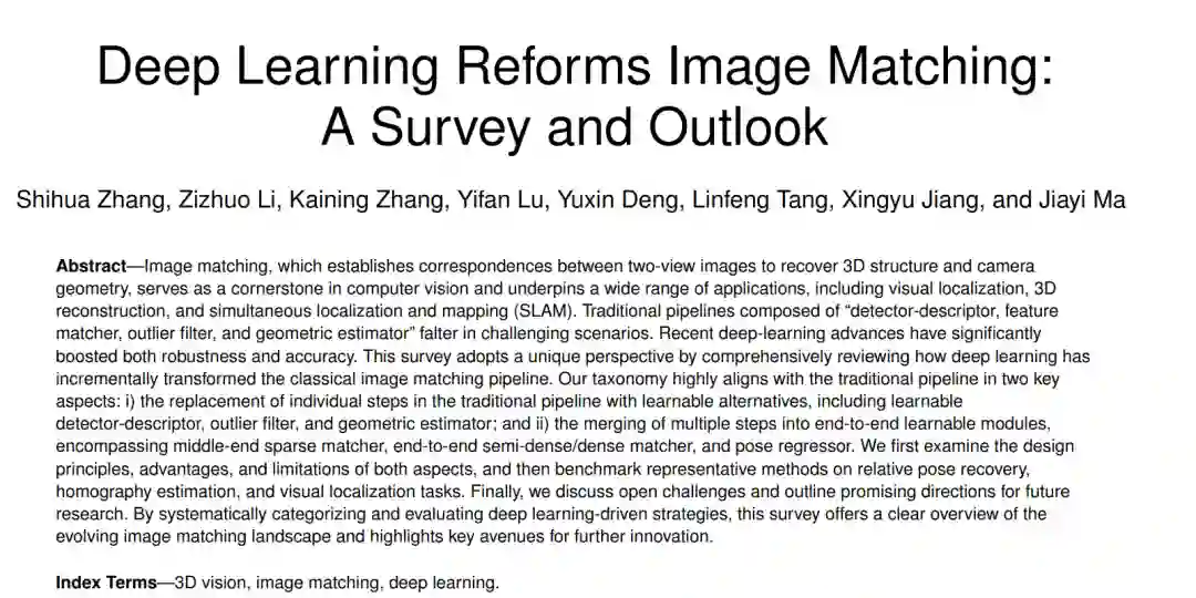 摘要——图像匹配旨在建立双视图图像之间的对应关系,以恢复三维结构和相机几何,是计算机视觉领域的基石,支撑着诸如视觉定位、三维重建和同时定位与建图(SLAM)等诸多应用。传统图像匹配流程由“特征检测-描述子、特征匹配、离群点过滤与几何估计器”组成,在复杂场景下往往表现不佳。近年来,深度学习的发展显著提升了图像匹配的鲁棒性和准确性。本文从一个独特视角出发,全面回顾了深度学习如何逐步革新经典图像匹配流程。我们提出的分类方法在两个关键方面与传统流程高度契合: i)将传统流程中的各个步骤替换为可学习的模块,如可学习的特征检测-描述子、离群点过滤器和几何估计器; ii)将多个步骤整合为端到端可学习的模块,如中层稀疏匹配器、端到端半稠密/稠密匹配器和位姿回归器。 我们首先分析这两种策略的设计原则、优势与局限性,随后在相对位姿恢复、单应性估计和视觉定位等任务上对典型方法进行基准评测。最后,本文讨论了当前的开放性挑战,并展望未来的研究方向。通过系统地分类与评估基于深度学习的图像匹配策略,本文为不断演进的图像匹配研究提供了清晰的全景视图,并指出了值得深入探索的关键路径。 关键词——三维视觉,图像匹配,深度学习。