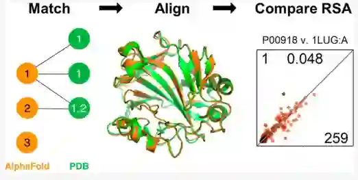 蛋白质数据库(Protein Data Bank)收录着成千上万实验鉴定的蛋白质结构数据,可惜的是,目前PDB仅收录35%的人源蛋白质的结构。近年发布的深度学习蛋白质结构预测工具AlphaFold2(AF2)能够从蛋白序列准确预测蛋白质结构,可以在一定程度上弥补PDB收录结构数量上的不足。然而如何评价AF2的预测结果的准确程度颇为重要。 近期,丹麦科技大学的Kasper P. Kepp教授团队提出使用精确计算残基的相对溶剂可及表面(relative solvent accessible area ,RSA)作为评估指标,可用以评价AF2对蛋白质结构预测的准确度。作者认为残基的溶剂可及表面积包含着蛋白质功能和进化信息,是一个直接用于深度学习模型训练或外部验证的可解释自然特征。为了验证猜想,作者建立了一个AF2预测结构和实验结构相对应的数据对库并针对RSA进行了一系列测试。该工作近期发表于美国化学会出版的计算化学核心期刊Journal of Chemical Information and Modeling[1]。 首先,作者从AF2预测结构数据库(AlphaFold Protein Structure Database)获取人源参考蛋白质组;从PDB中获取使用X-ray晶体学方法鉴定、分辨率<2.0Å的人源蛋白质结构。然后将每个AF2结构先后通过匹配UniProt编号配对、序列比对,产生对应的数据对库。为了探寻可能影响AF2性能的其他因素,作者依据(1)序列一致性比例(2)实验结构的分辨率(3) 实验结构是否为单体为基准,拆分成子数据集,将这些结构进一步整理成分为六个非重叠组。 随后,研究者计算并比较了AF2生成结构(RSAAF)和实验结构(RSAEP)中每个残基主干的RSA,从平均RSAExp值计算出的平均绝对偏差(MAE)、平均符号偏差(MSD)和标准差(SD),发现仅针对蛋白质单体而言,MSD和SD值不依赖于序列一致性或实验结构的分辨率,说明AF2预测单体结构的性能与配体的存在无关。