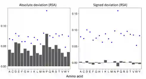 图 4 实验和AF2结构之间的一致性取决于残基类型;左:MAE。右:MSD(RSAAF−RSAExp);SDs显示为蓝点小结