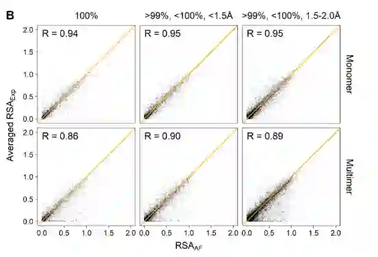 图 1 根据序列一致性、实验结构分辨率和实验结构的单体-多聚体状态分组的结果实验对比的AF2和RSA值 为了确定AF2预测置信度pLDDT与预测****RSA的准确性是否相互影响,作者将结构对上的残基按照pLDDT和RSA分别划分区间,发现RSAAF没有因残基pLDDT值低受到影响(图2A);但在高****RSA的残基上AF2预测置信度较低,AF2对于低****RSA的包埋残基预测更准确。(图2B)