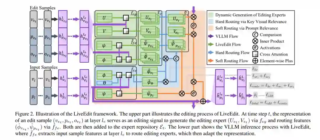 为弥合终身LLM编辑与VLLM之间的差距,本文提出LiveEdit,一种用于终身VLLM知识编辑的新方法。我们首先训练一个“编辑专家生成器”,能够为每次编辑实例独立生成低秩专家,旨在修正VLLM的相关输出响应。为此,我们设计了一种硬过滤机制,利用视觉语义知识在推理阶段粗略剔除与输入查询视觉无关的专家。随后,我们引入一种基于文本语义相关性的软路由机制,以融合多个视觉相关专家,从而实现多专家信息整合。