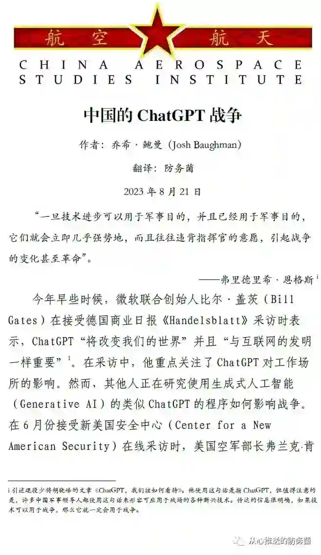 作者:防务菌8月21日,美国空军大学专注研究中国航空航天领域发展的智库“中国航空航天研究所”(一家美国空军智库,附设于美国空军大学,成立于2015年6月22日,其职责是评估中国的航空航天相关训练和作战能力,为美国国防部和美国政府的决策制定者提供专家研究和分析支持)分析师乔希·鲍曼(Josh Baughman)发表了一份名为《中国的ChatGPT战争》的研究报告(报告中英全文可联系防务菌获取)提出,“总体而言,中国明白需要成为战场上生成式人工智能(Generative AI)的先行者(或紧密跟随者),以‘牢牢掌握智能战争的战略主动权,抢占未来军事竞争的制高点’”。