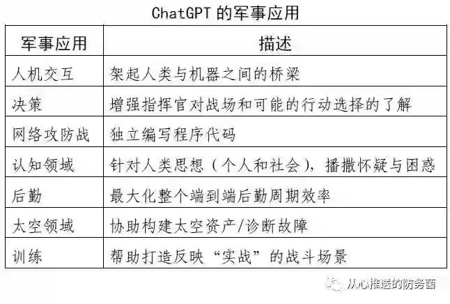 一、人机交互由于生成式人工智能可以理解人类语言和机器语言,因此它可以帮助分析师在更短的时间内消化大量信息。乔希·鲍曼写道,PLA预计类似ChatGPT的程序将成为一个联合作战系统,可以规划任务、指定目标和打击目标。 二、决策通过处理大量信息,生成式人工智能可以帮助指挥官更快地选择最佳作战行动计划,并为孤立的部队实现分散指挥。 三、网络攻防战乔希·鲍曼在报告里写道,PLA媒体预测生成式人工智能可以帮助黑客“设计、编写和执行恶意代码,构建机器人和网站来诱骗用户共享信息,并发起高度针对性的社会工程诈骗和网络钓鱼活动”。此类攻击性工具可能会变得如此复杂,以至于只有相应的人工智能系统才可能是防御它们的唯一方法。 四、认知领域乔希·鲍曼在报告中援引PLA媒体消息人士讨论使用生成式人工智能“有效地生成大量假新闻、假图片,甚至假视频来迷惑公众”。 五、后勤生成式人工智能可以帮助分配资源、管理仓库、规划供应路线,并比以前更快地识别效率低下的地方。它还可以用于预测未来的材料需求并制定采购资源的预算。 六、太空领域在大气层之上,物体以几倍于声速的速度移动,生成式人工智能可以帮助监测卫星的健康状况。它还可以帮助工程师设计新的运载火箭和航天器。 七、训练PLA缺乏现实世界的战斗经验,但PLA作家表示,生成式人工智能可能有助于“通过简单的人类语言描述快速构建战斗模拟”,特别是与历史训练数据和最新情报相结合时。