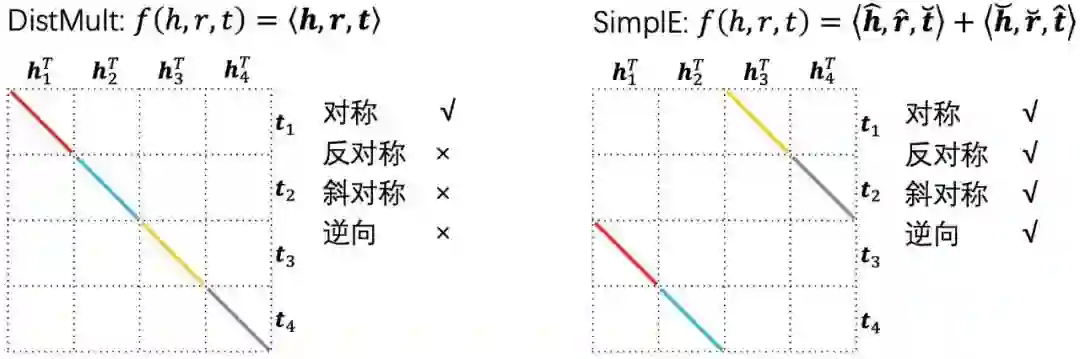 AutoBLM首先对评分函数建立了统一的表达形式及语义驱动的搜索空间。在现有的打分函数中,双线性模型(BiLinear Model, BLM)是一类比较好的模型,其表达能力强、复杂度低、建模效果好。图3展示了两个不同的双线性模型的表达式,以及他们的抽象矩阵表达,DistMult[4]和SimplE[5]不同的矩阵结构,决定了他们能否对各类关系进行建模。常见的关系类型包括对称性(如朋友关系),反对称性(如长辈关系),斜对称性(如属性关系),和逆向关系(如长辈和晚辈)。