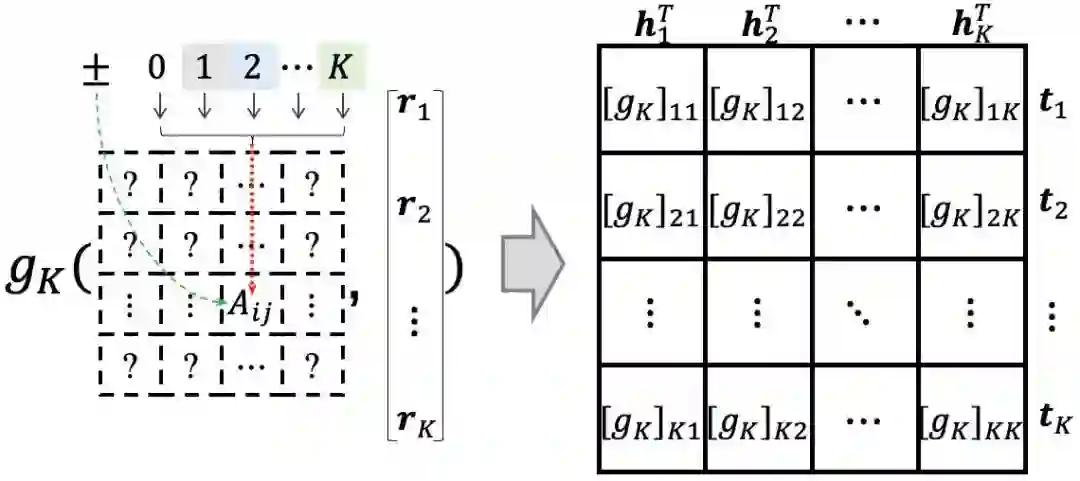为了适应不同知识图谱中的不同语义模式,AutoBLM基于双线性模型,构建了统一的搜索空间,如图4所示,是一个跟关系嵌入相关的方阵,其表达形式由结构矩阵决定,而评分函数之间的区别就在于结构的不同。这样的搜索空间可以有效覆盖已知的双线性模型,同时有能力探索新颖的、未被尝试的模型。