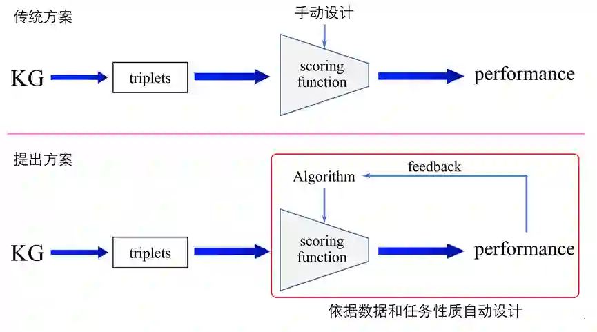 如图2所示,通常来说知识图谱领域的评分函数是人为定义设计的,这需要很强的专家知识,对任务、数据有着独到的理解。自动化的解决方案,算法根据模型效果的反馈,来自主设计评分函数,通过不断循环迭代来优化评分函数,实现在特定任务数据上低门槛,高性能的评分函数设计。