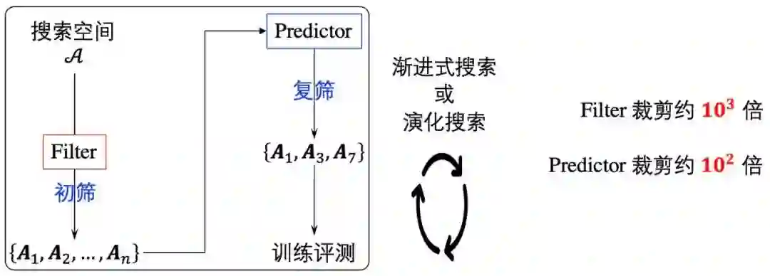 考虑到搜索空间非常巨大且训练和评估每一个结构都需要非常多时间,如何快速有效地搜索更好的结构,是搜索算法所需要关心的问题。AutoBLM在搜索算法的设计上,充分考虑了搜索空间的性质,在给定结构的基础上,对结构先进行一定程度的筛选,再进行模型评估,从而节省开销。如图5所示,AutoBLM利用Filter过滤掉一些非满秩、等价的结构进行初筛,再利用Predictor对结构的对称性特征进行评估,进一步筛选出可能较好的几个结构,对搜索空间进行大幅度的裁剪。在外层,AutoBLM利用渐进式搜索方式,AutoBLM+利用演化的搜索方式,不断迭代、优化,得到更好的结构。