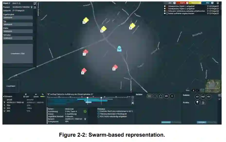 多种类无人驾驶飞行器(UAV)的使用越来越重要。因此,人类和机器人之间的互动及其互动设计变得越来越重要,特别是在战场上的军事侦察。然而,越来越大的无人机蜂群导致许多需要解决的挑战,例如,具有高动态的复杂情况增加了对用户的要求。在这项工作中,研究了以应用为导向的人类与蜂群互动的展示方案,其重点是作战管理系统中的蜂群。在一项文献调查中,确定了潜在的应用和当单个操作者监控作为高度自动化系统的大型蜂群时可能出现的挑战。此外,还确定了已经存在的设计准则。基于这些结果,为获得全面的态势感知,对蜂群的可视化的四种不同布局进行了原型设计。