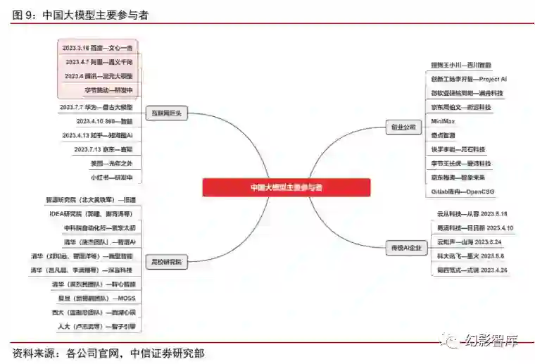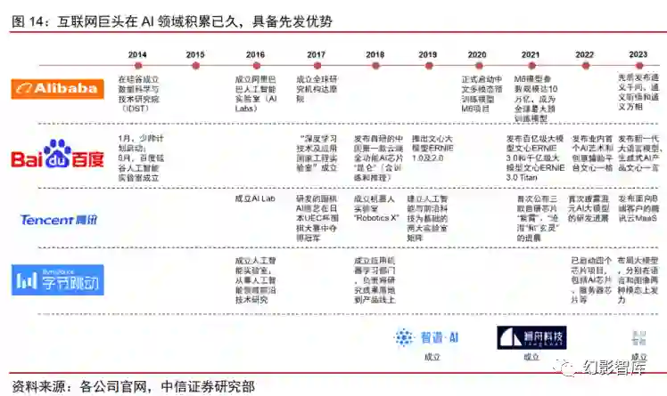 ****ChatGPT 获得良好用户反响并在全球范围引发关注以来,中国头部科技企业(阿里、百度、腾讯、华为、 字节等)、新兴创业公司(百川智能、MiniMax 等)、传统 AI 企业(科大讯飞、商汤科技等)以及高 校研究院(复旦大学、中科院等)亦加速大模型领域投入。 当前国内大模型仍处研发和迭代的早期阶段, 各个大模型的性能差异及易用性仍在市场检验的过程当中,预计国内大模型领域竞争格局的明晰仍需一 定时间,但是互联网巨头在 AI 领域积累已久,具备先发优势。