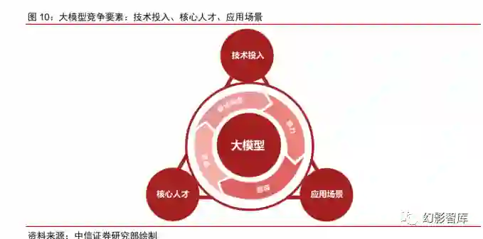 技术投入、核心人才和应用场景构成大模型竞争的核心壁垒。大模型是一个重资源禀赋、高进入门槛的 赛道,其对算法模型的有效性、高质量的数据、算力的支撑能力均有极高要求,模型的优化迭代亦有赖 于资金和人才的持续投入。此外,大模型的实际落地和行业应用能力也是市场检验的重要标准。