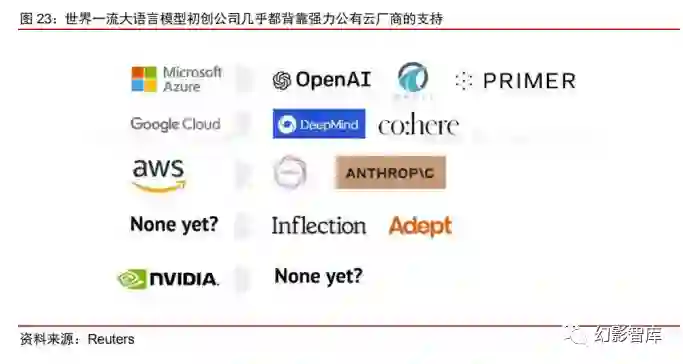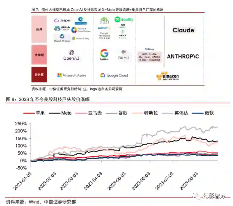 从海外大模型格局来看,目前已经形成较为清晰的双龙头领先+Meta 开源追赶+垂类繁荣的格局。同时, 基于通用大模型能力已相对成熟可用,其上的应用生态已逐渐繁荣。 得益于对先进算法模型的集成以及较早的产品化,OpenAI 不仅展现了 GPT 在人机对话中的超预期表现, 同时基于 GPT 的应用生态也已逐渐繁荣,微软数款产品(Bing、Windows 操作系统、Office、浏览器、 Power Platform 等)、代码托管平台 GitHub、AI 营销创意公司 Jasper 等均已接入 GPT。 谷歌在人工智能领域持续投入,其提出的 IeNet 卷积神经网络模型、Transformer 语言架构、BERT 大 语言模型等均对全球人工智能产业产生重要推动。 但由于公司团队变动及更谨慎的产品化落地的态度, 谷歌前期尚未大规模推出面向 C 端的 AI 产品。在 ChatGPT 快速流行的带动下,谷歌亦推出聊天机器人 Bard 及 PaLM2,并将接入谷歌的协作与生产力工具 Workspace 以及与 Spotify、沃尔玛、UberEats 等 外部应用融合。 Meta 通过开源方式快速追赶,7 月发布最新开源大模型 LLaMA2,使用 2 万亿 tokens 训练,上下文长 度翻倍,实现了更强大的表现能力和更广泛的应用场景。 此外,Anthropic、Cohere、Hugging Face 等基于各自的垂类特色和定制化服务也在海外 AI 市场中扮 演着重要角色。