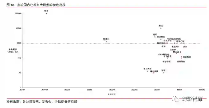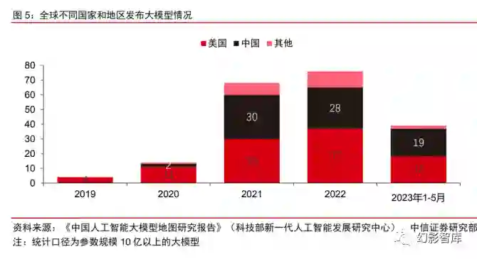 从全球范围来看,中美在大模型领域引领全球发展。其中,基于在算法模型研发上的领先优势,美国大 模型数量居全球首位,根据中国科学技术信息研究所、科技部新一代人工智能发展研究中心联合发布的 《中国人工智能大模型地图研究报告》,截至 2023 年 5 月,美国已发布 100 个参数规模 10 亿以上的 大模型。 中国亦积极跟进全球大模型发展趋势,自 2021 年以来加速产出,如 2021 年 6 月北京智源人工 智能研究院发布 1.75 万亿参数量的悟道 2.0、2021 年 11 月阿里 M6 大模型参数量达 10 万亿等。截至 2023 年 5 月,我国已发布 79 个大模型,在全球范围占据先发优势。但考虑到数据安全、隐私合规以及 科技监管等因素,中美的大模型市场有望形成相对独立的行业格局。
